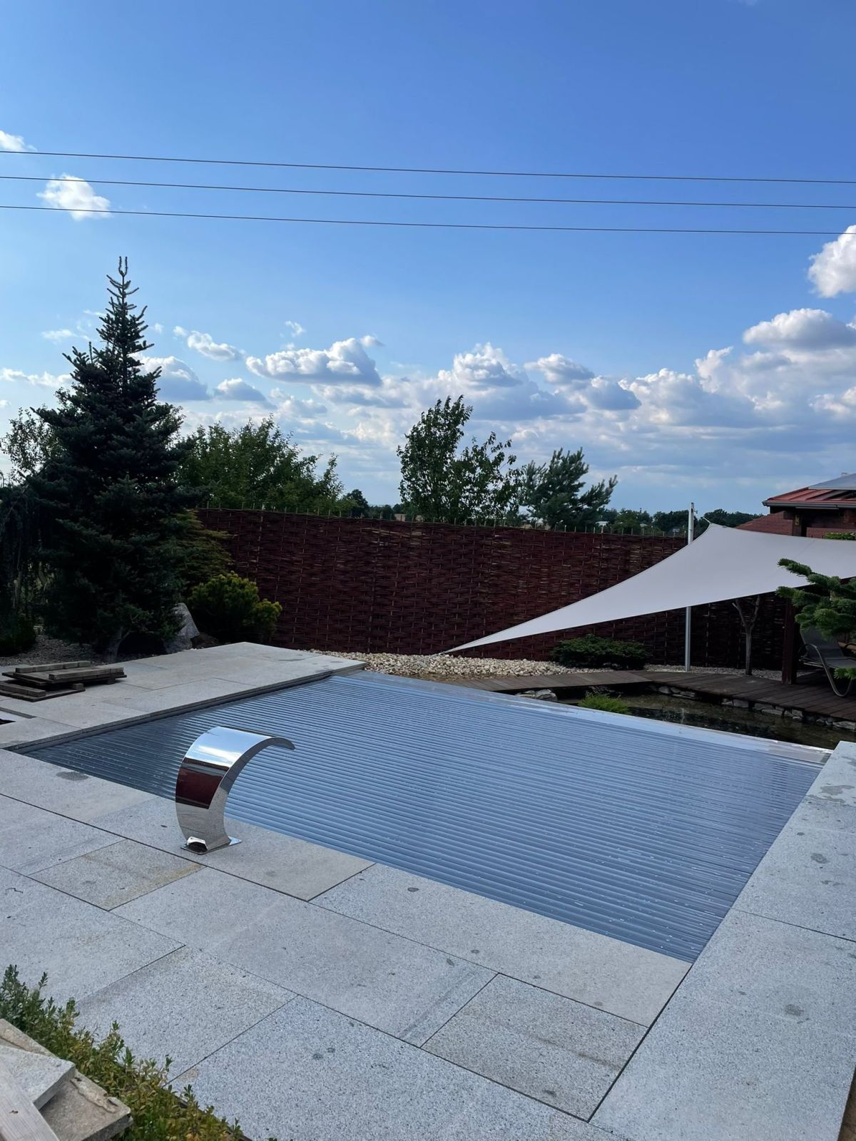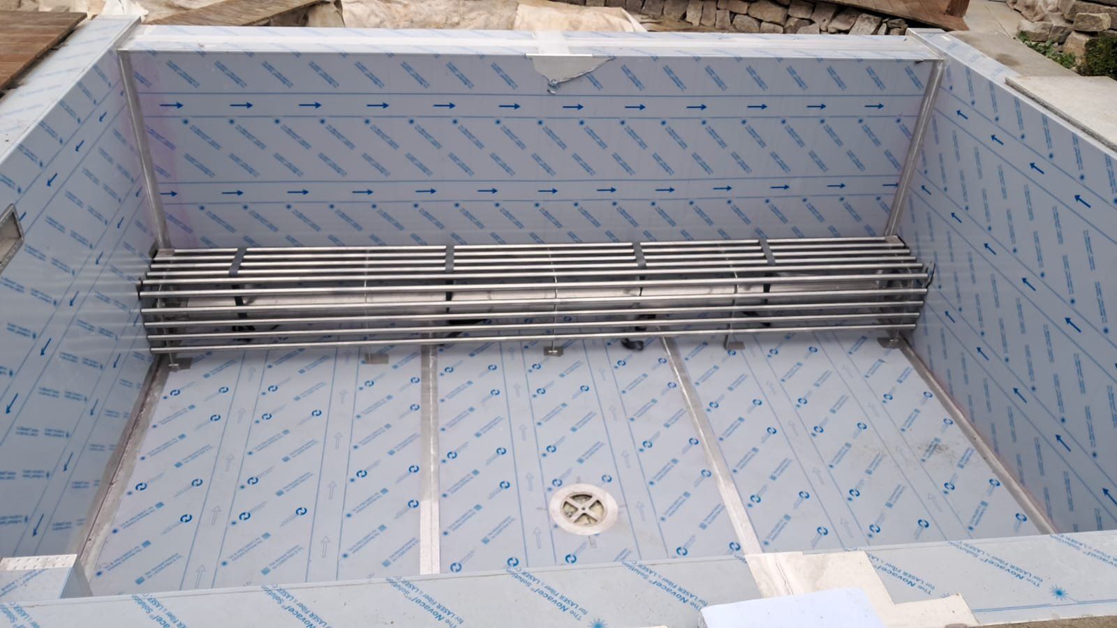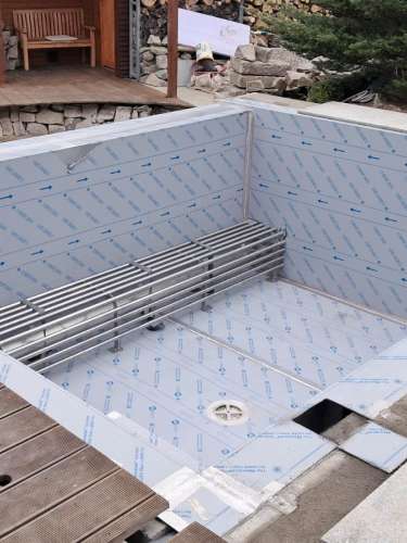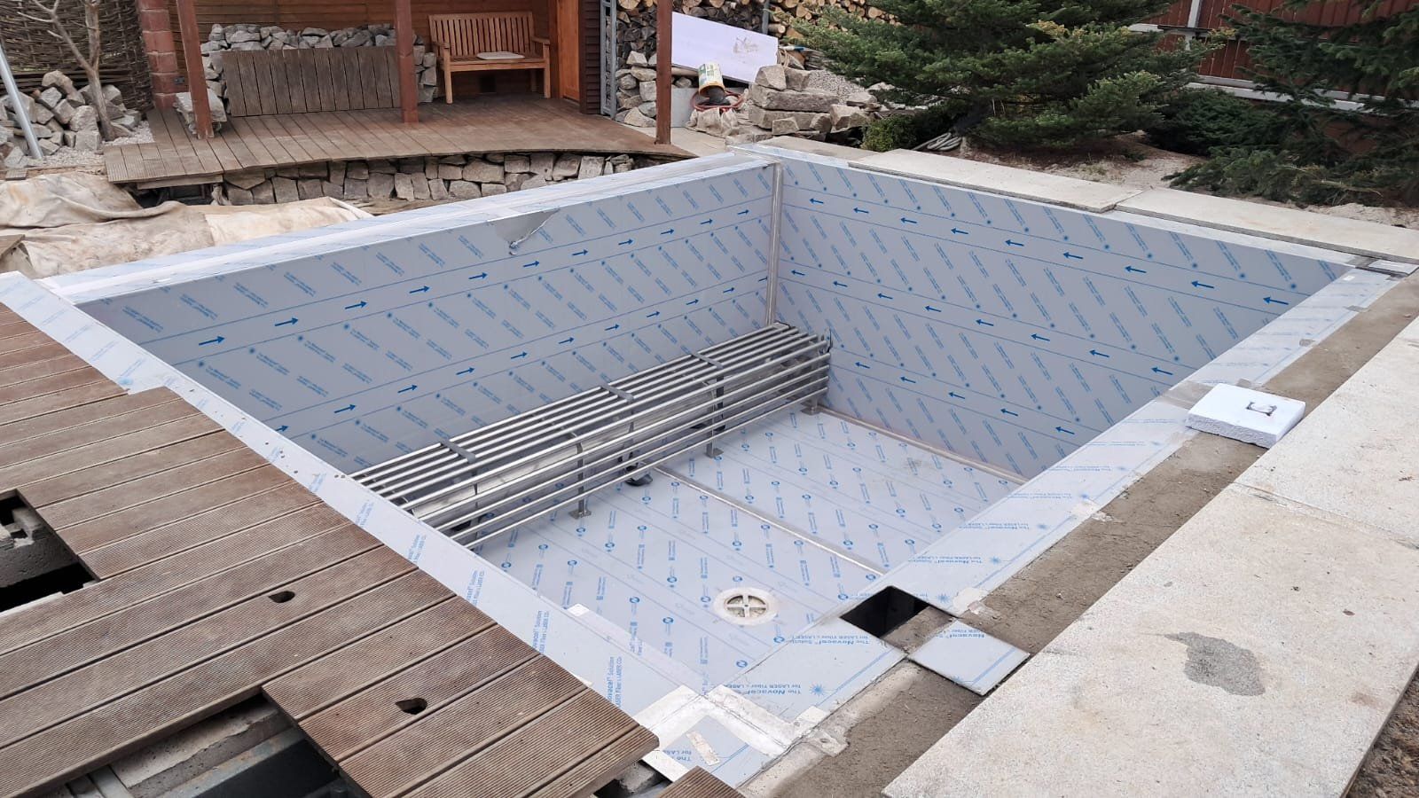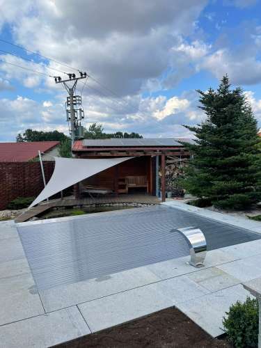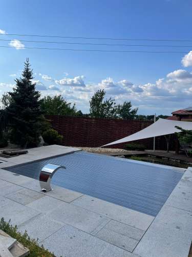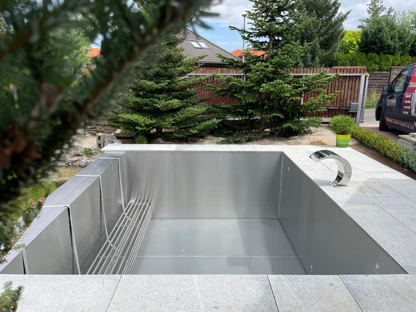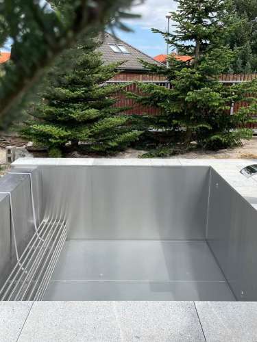 Rekonstrukce fóliového bazénu na nerezový bazén s infinity přelivem, doplněný nerezovým chrličem a podvodní roletou ukrytou u dna bazénu pod trubkovou lavicí.