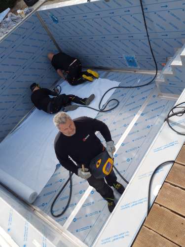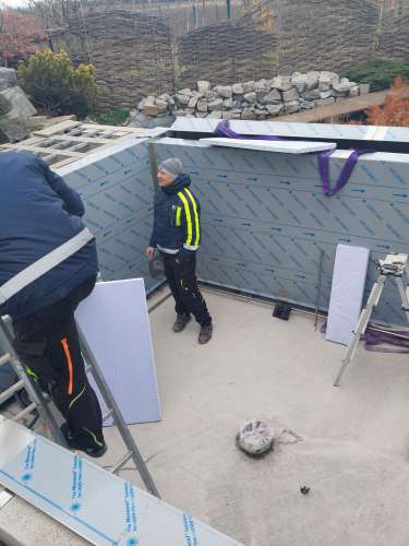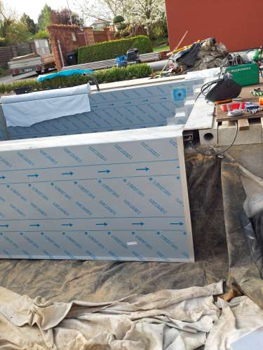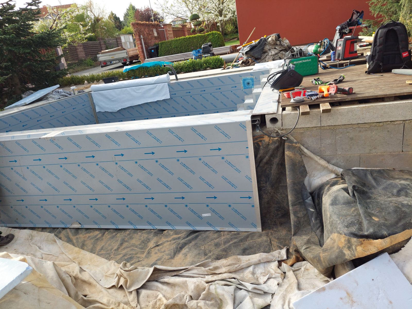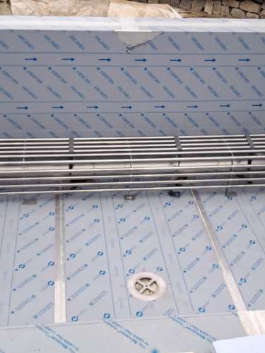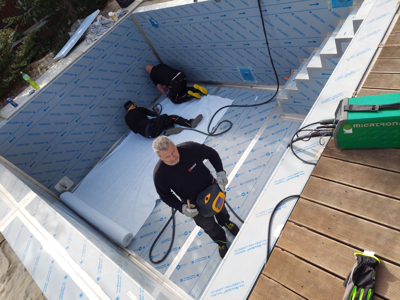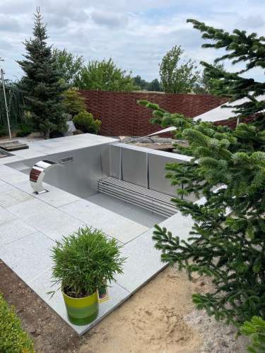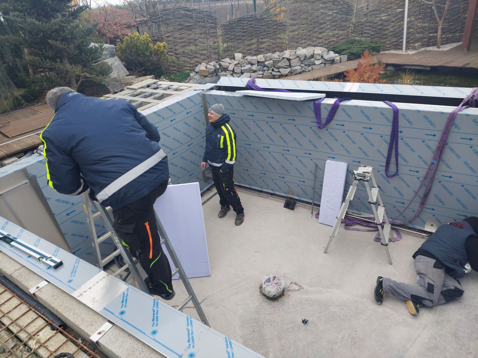 Rekonstrukce fóliového bazénu na nerezový bazén s infinity přelivem, doplněný nerezovým chrličem a podvodní roletou ukrytou u dna bazénu pod trubkovou lavicí.