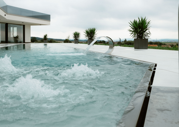 Precizně zpracované hrany, symetrické linie a perfektně řešený přelivový žlab přelivových bazénů ROKA potvrzují, že u tohoto typu realizací rozhoduje každý detail.