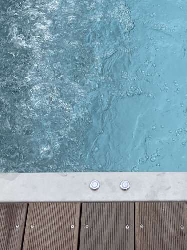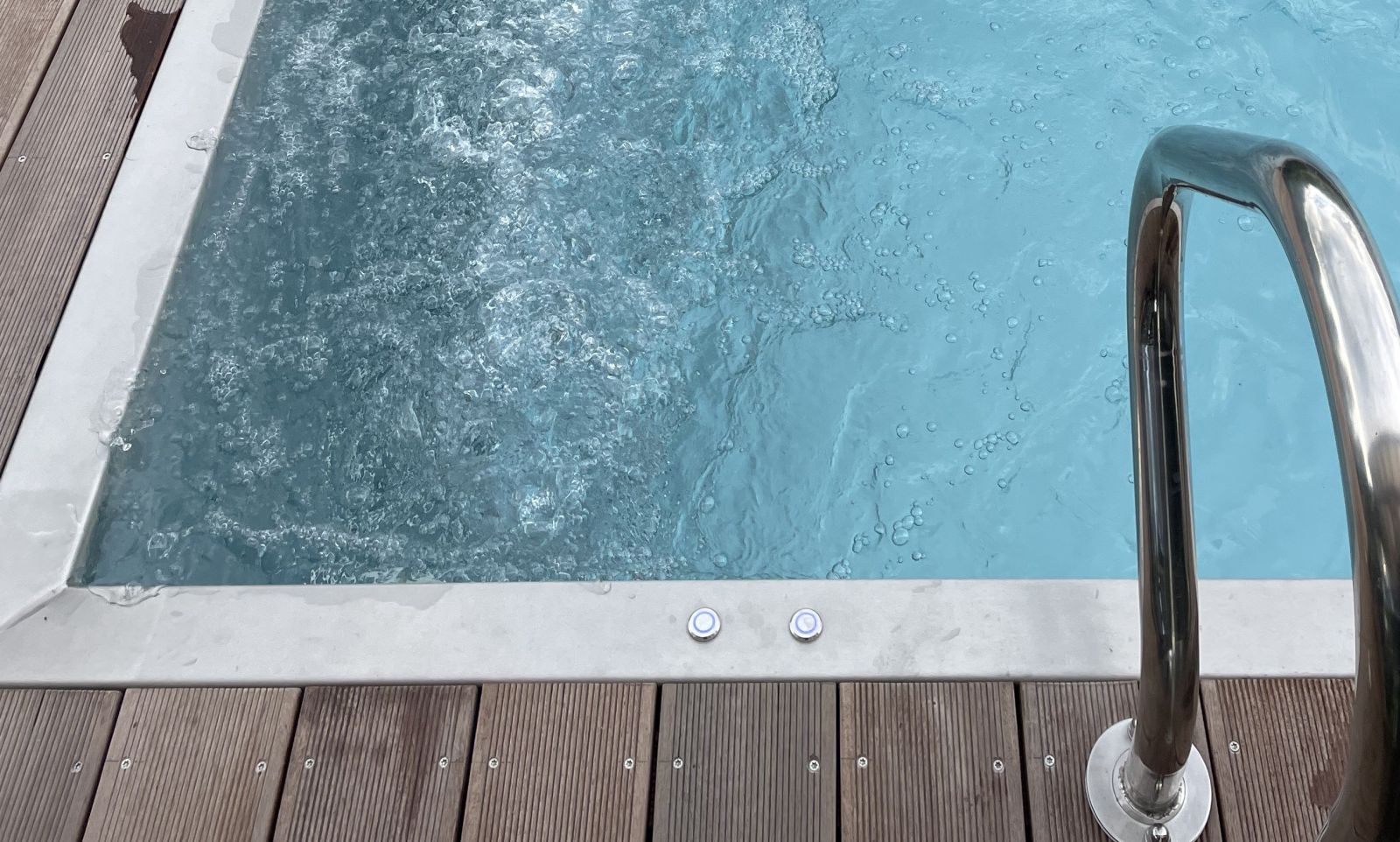 Vstup do bazénu je zajištěn přes výklenkové schody doplněné nerezovým madlem.