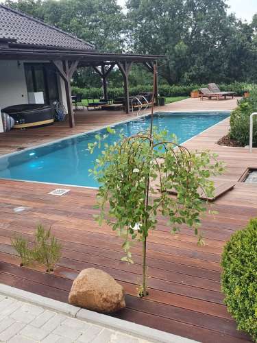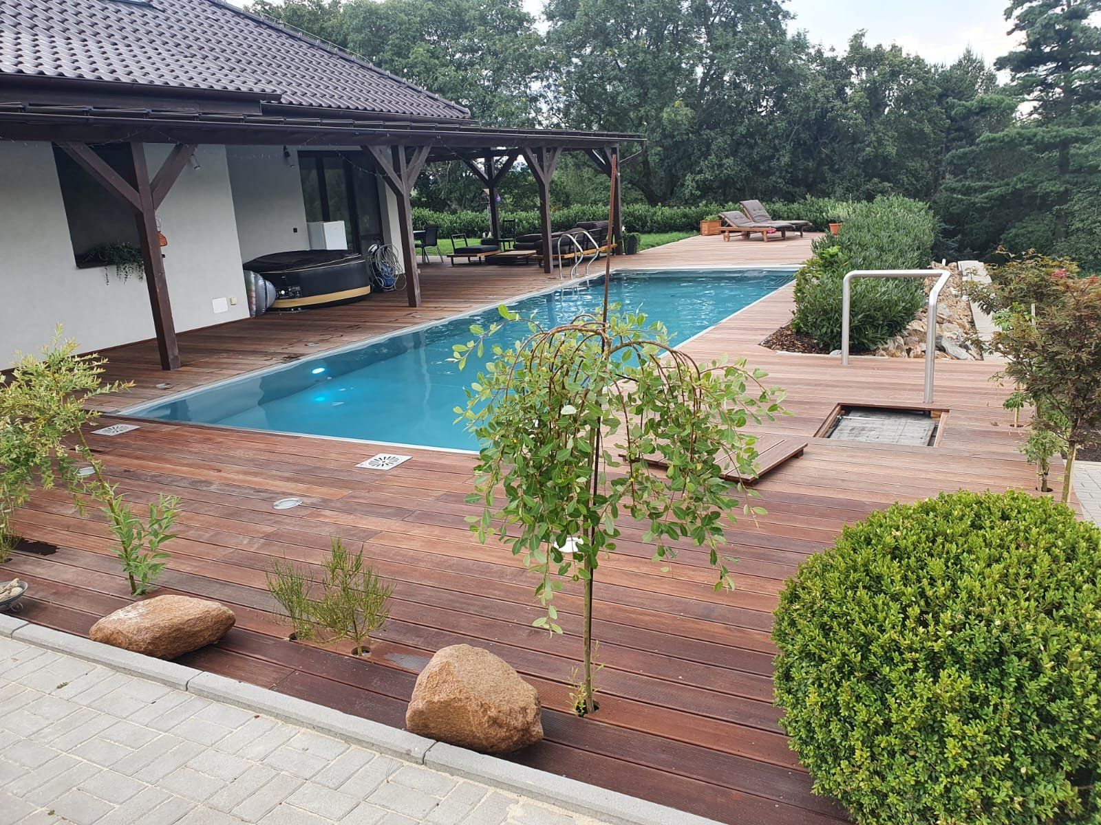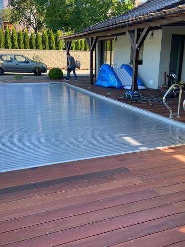 Představujem skimmerový bazén o rozměrech 11x4m s hl. vody 1,25m. Bazén je vybaven vzduchovací lavicí, osvětlením a podvodní roletou.