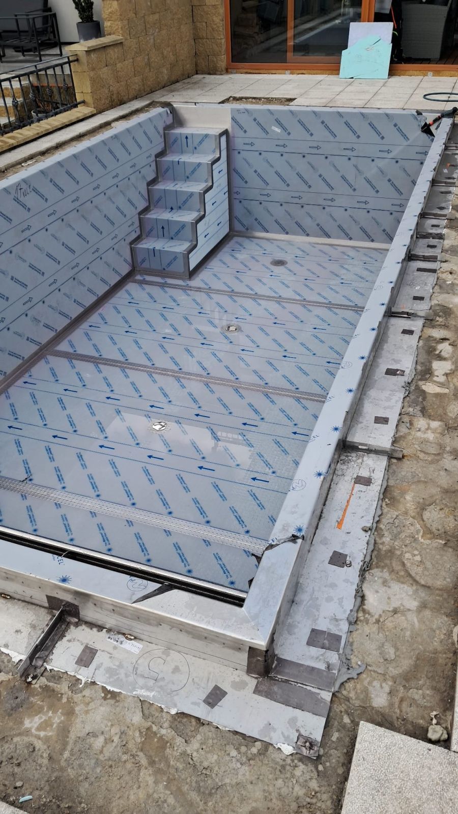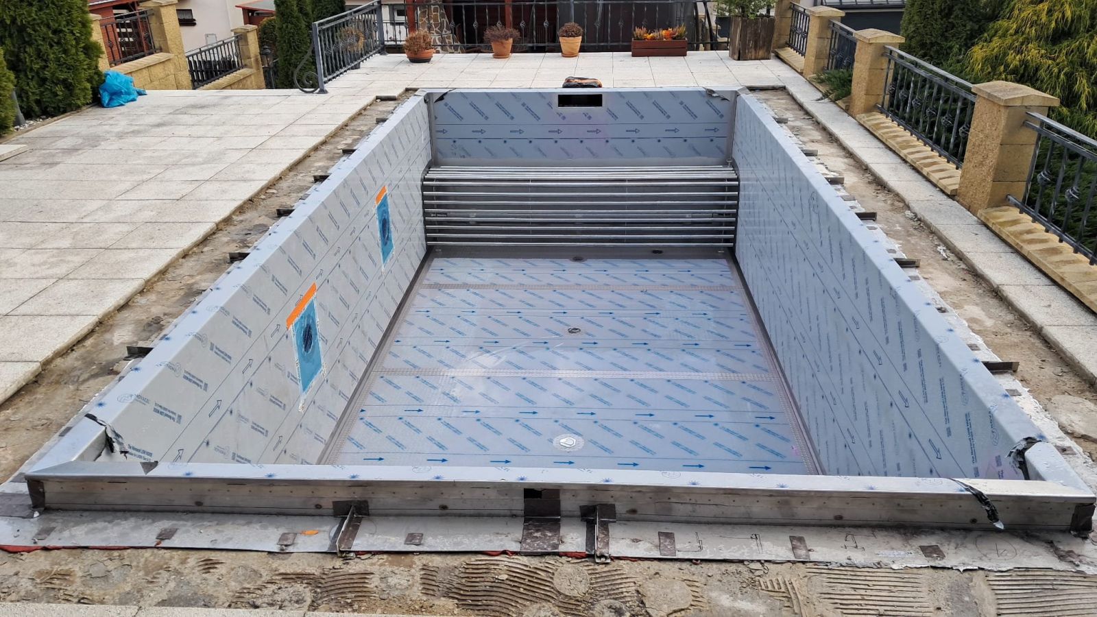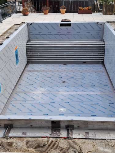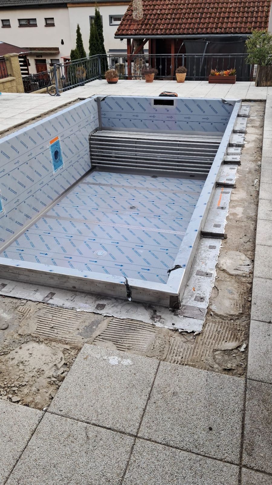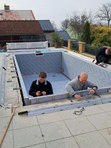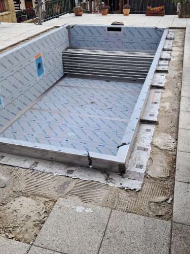 Investor se rozhodl vyměnit fóliový bazén za nerezový. Práce na rekonstrukci tohoto skimmerového bazénu jsou dokončeny. Rozměry bazénu jsou 6x3m s hloubkou vody 1,25m. Bazén byl nově vybaven podvodní roletou. Aby nemuselo dojít k větším stavebním úpravám původní bazénové jámy, byla roleta umístěna u dna bazénu, kde je chráněna trubkovým krytem, který slouží zároveň jako lavice pro sezení.