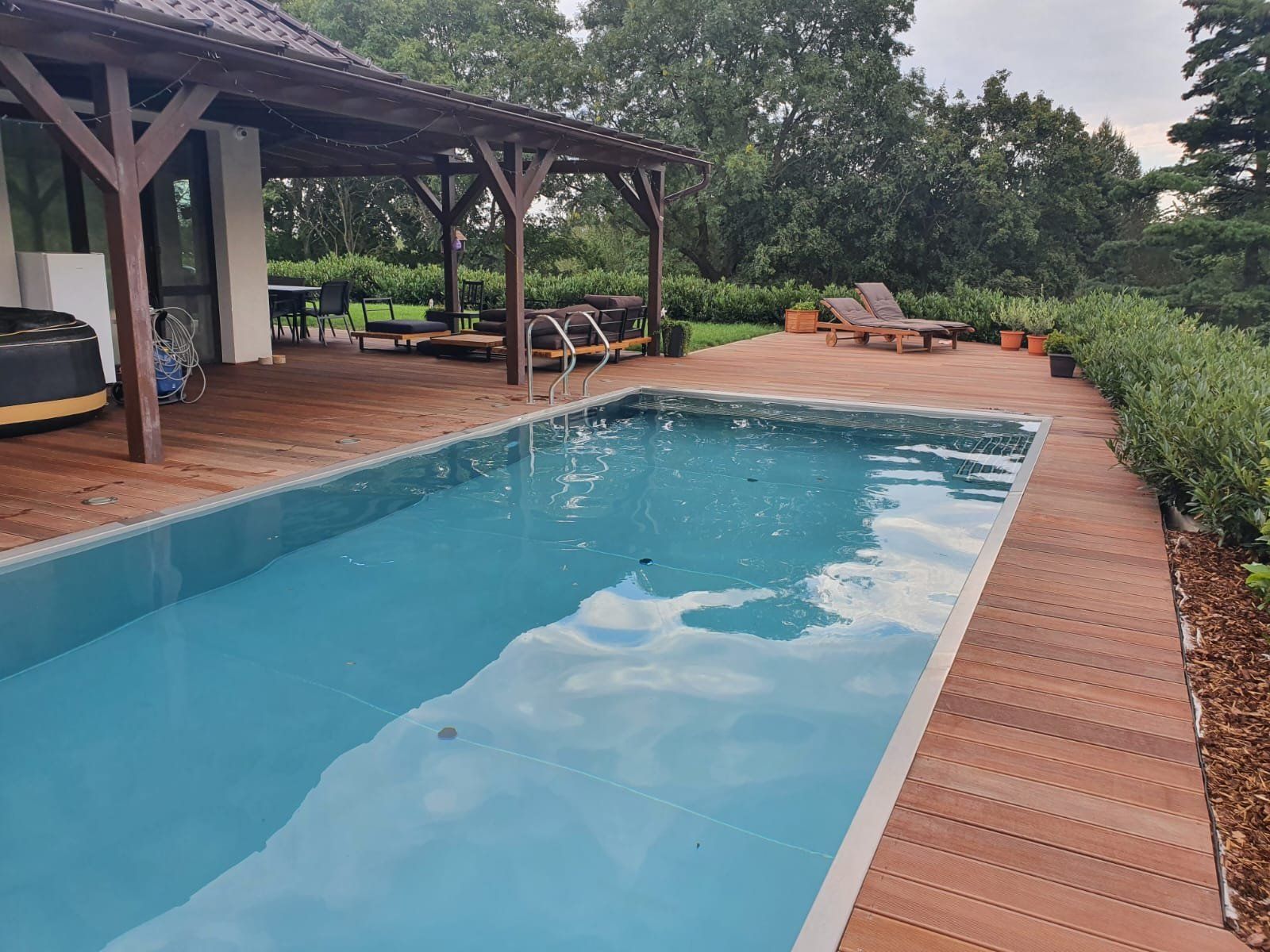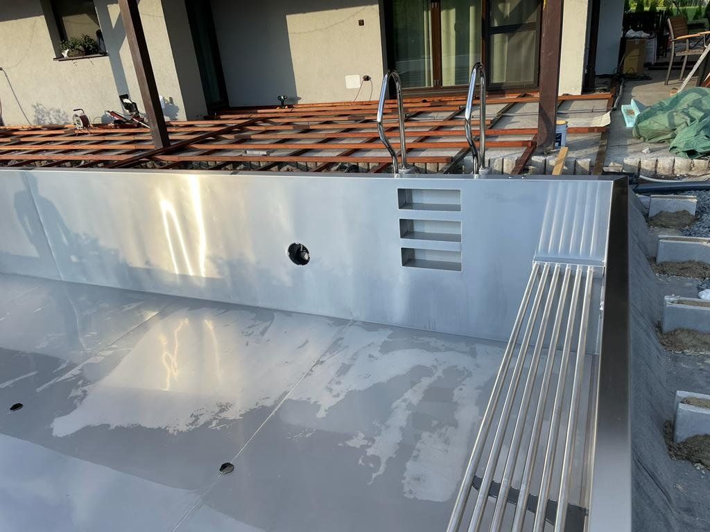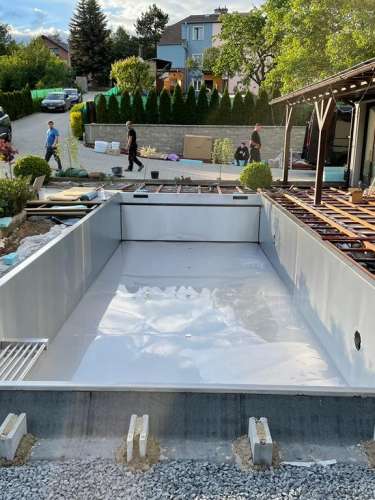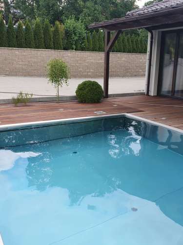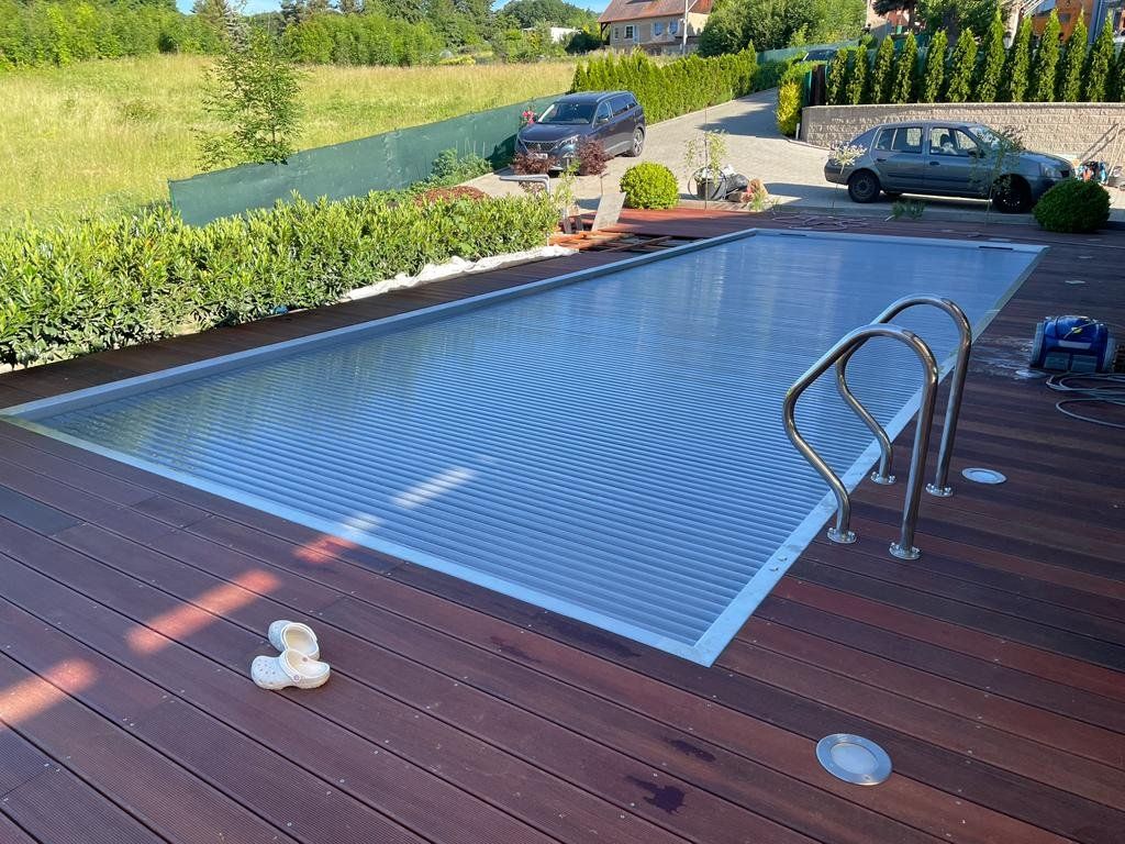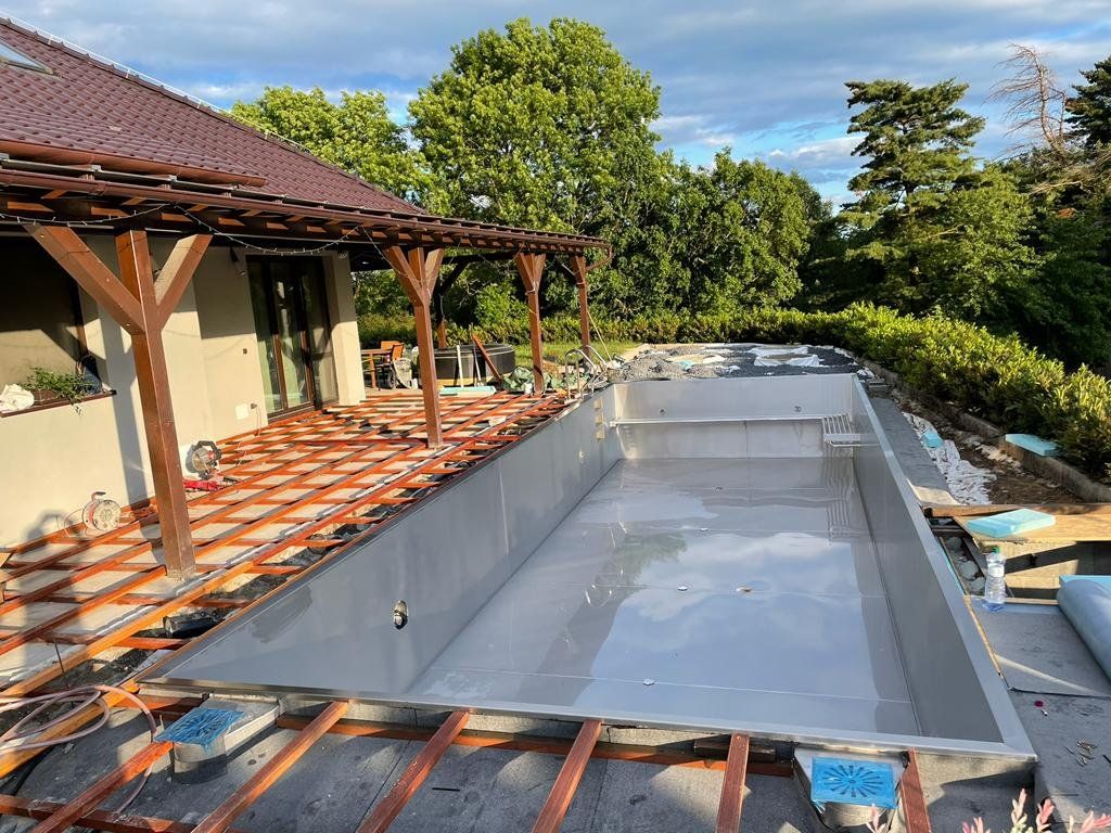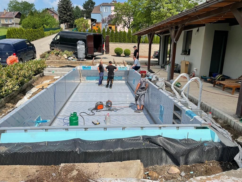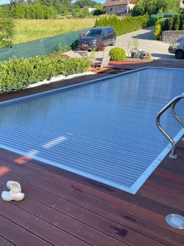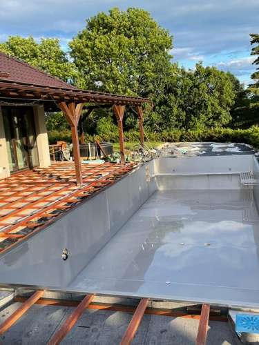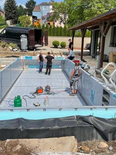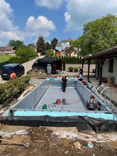 Dokončili jsme montáž skimmerový bazénu o rozměrch 11x4m. Bazén má 2 superskimmery a podvodní roletu ve stěně bazénu, ketrá nezmešuje užitnou plochu bazénu, je ukryta za přepážkou. Vstup do bazénu zajišťují výklenkové schůdky s madlem. Dno bazénu je osazneno dnovými vstupními tryskami. Věříme, že majiteli bude bazén dobře sloužit a jak je vidět, bude i krásným prvkem jeho zahrady.