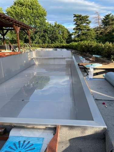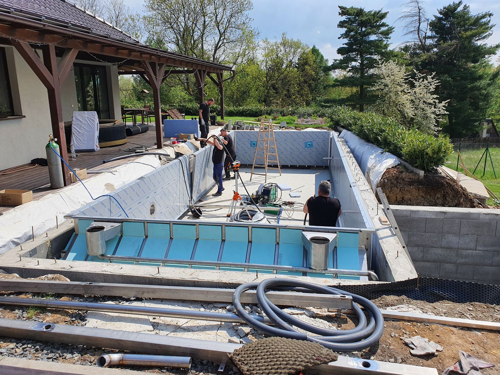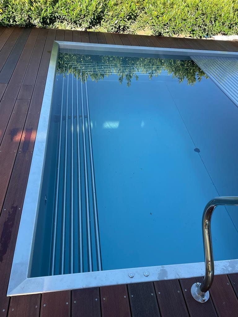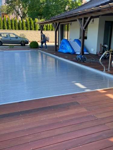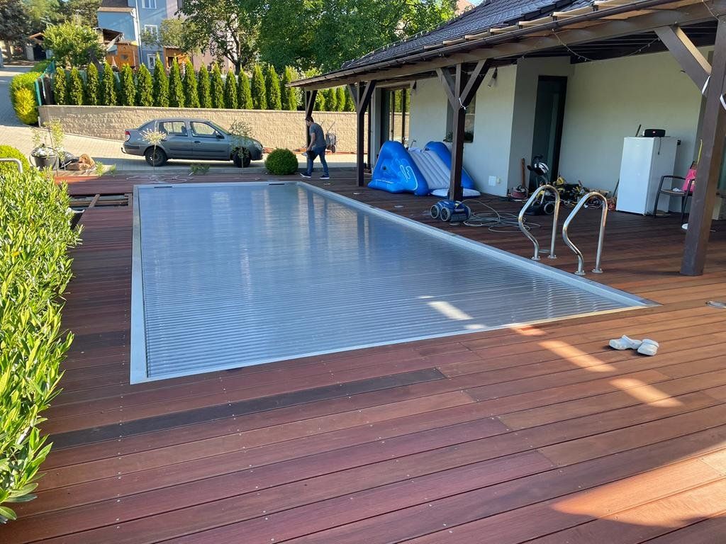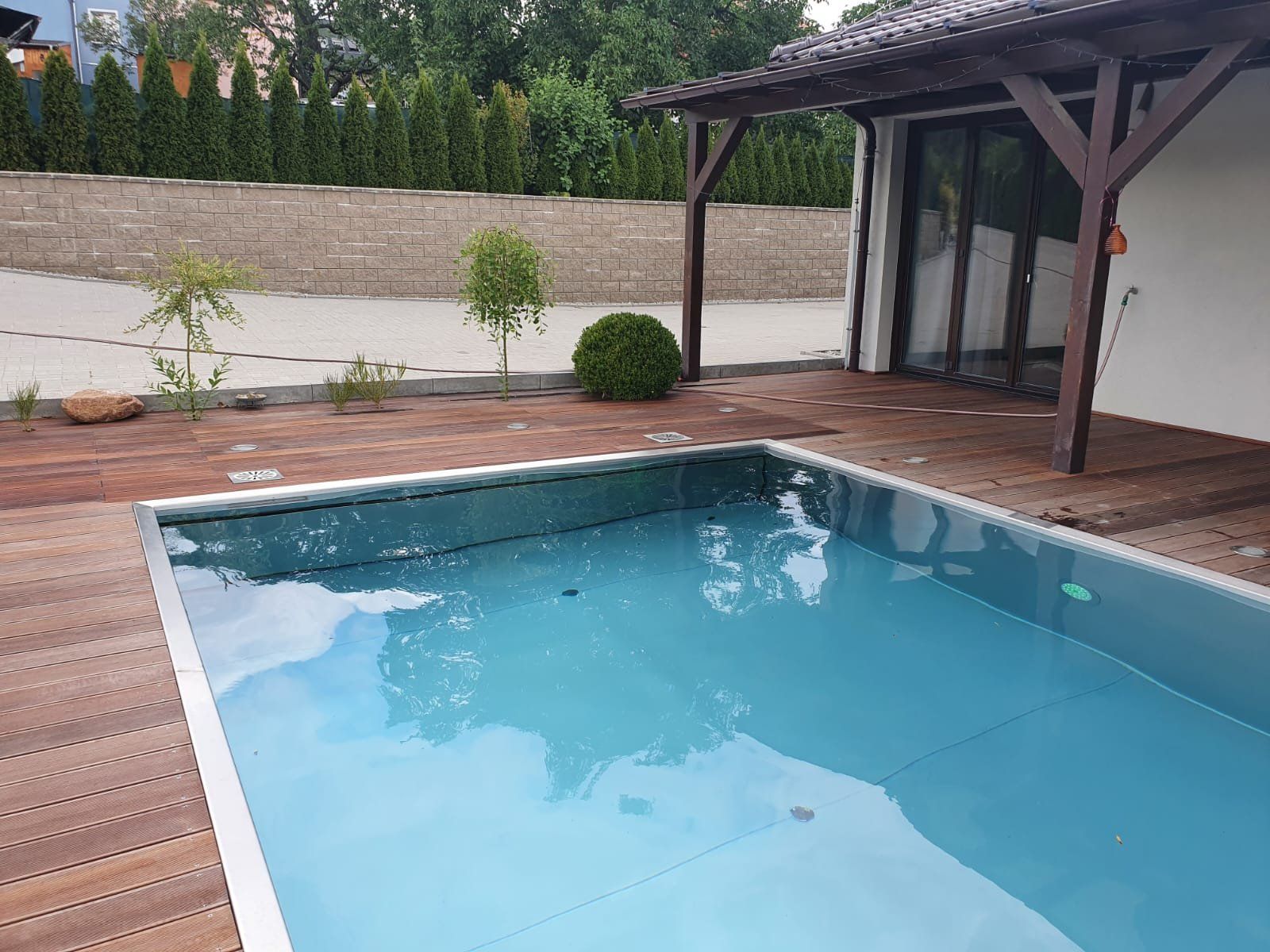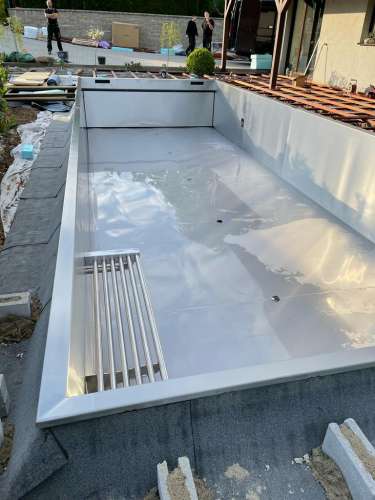 Dokončili jsme montáž skimmerový bazénu o rozměrch 11x4m. Bazén má 2 superskimmery a podvodní roletu ve stěně bazénu, ketrá nezmešuje užitnou plochu bazénu, je ukryta za přepážkou. Vstup do bazénu zajišťují výklenkové schůdky s madlem. Dno bazénu je osazneno dnovými vstupními tryskami. Věříme, že majiteli bude bazén dobře sloužit a jak je vidět, bude i krásným prvkem jeho zahrady.