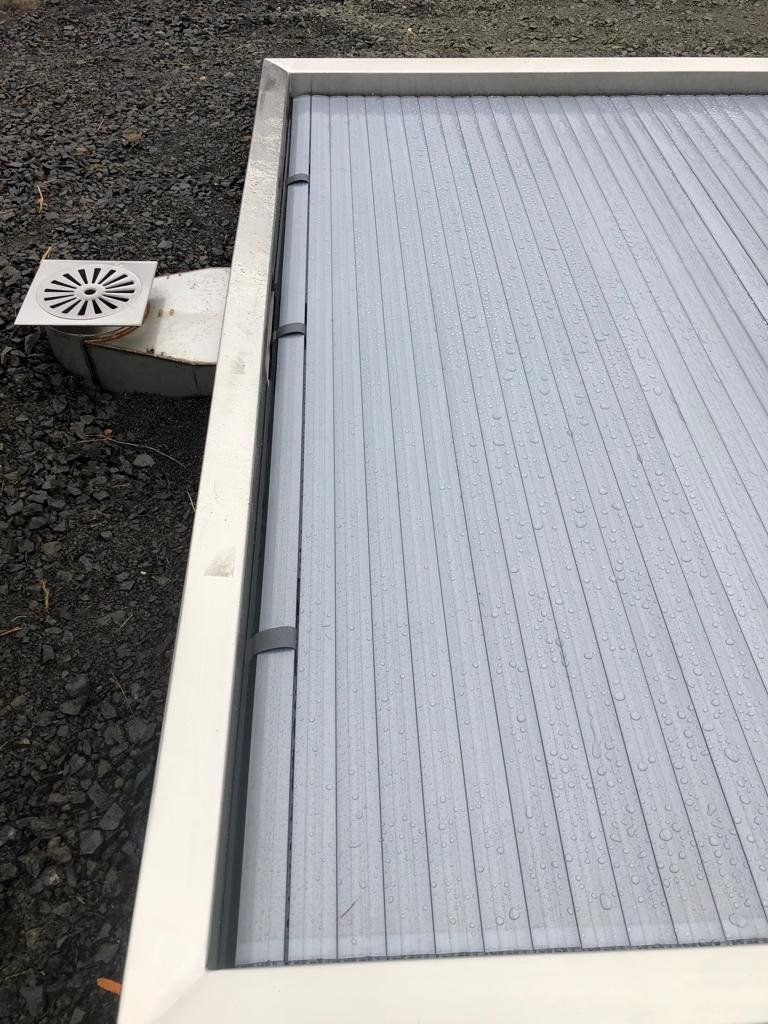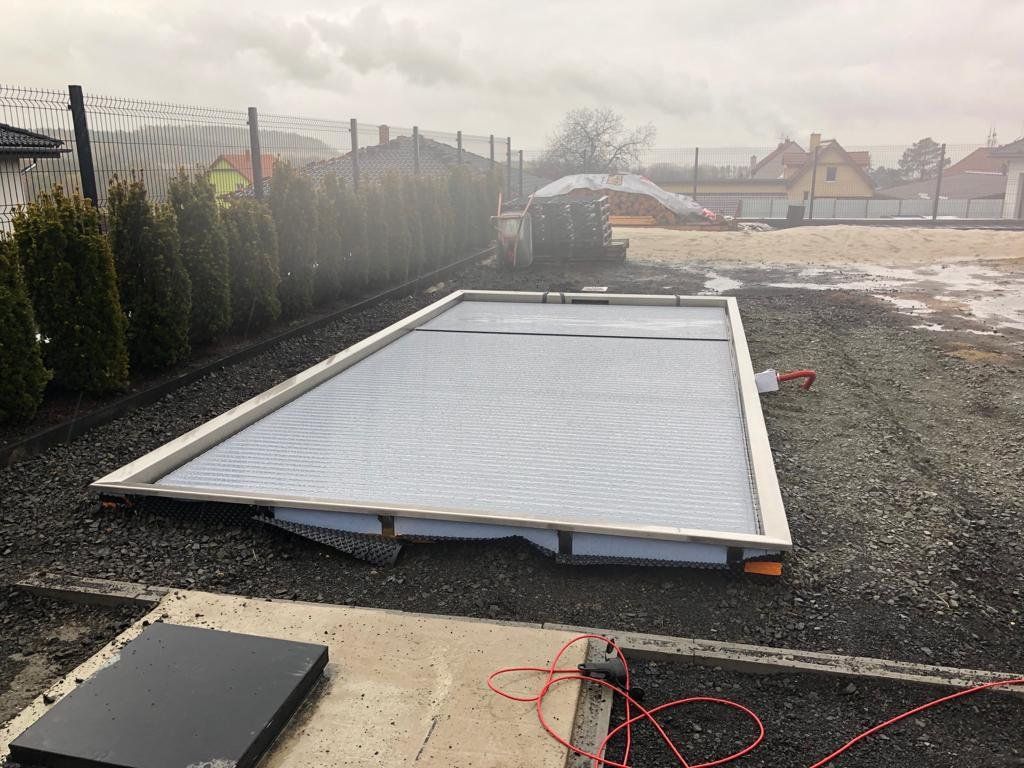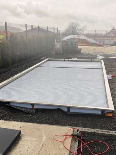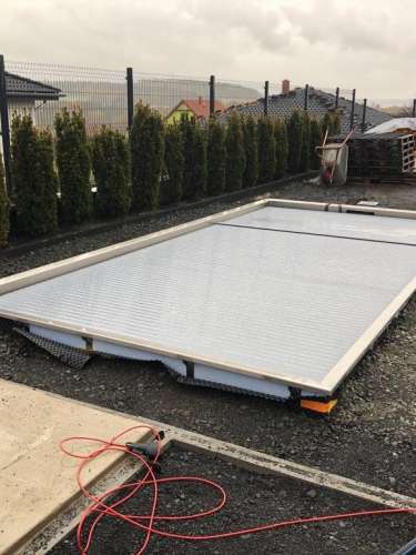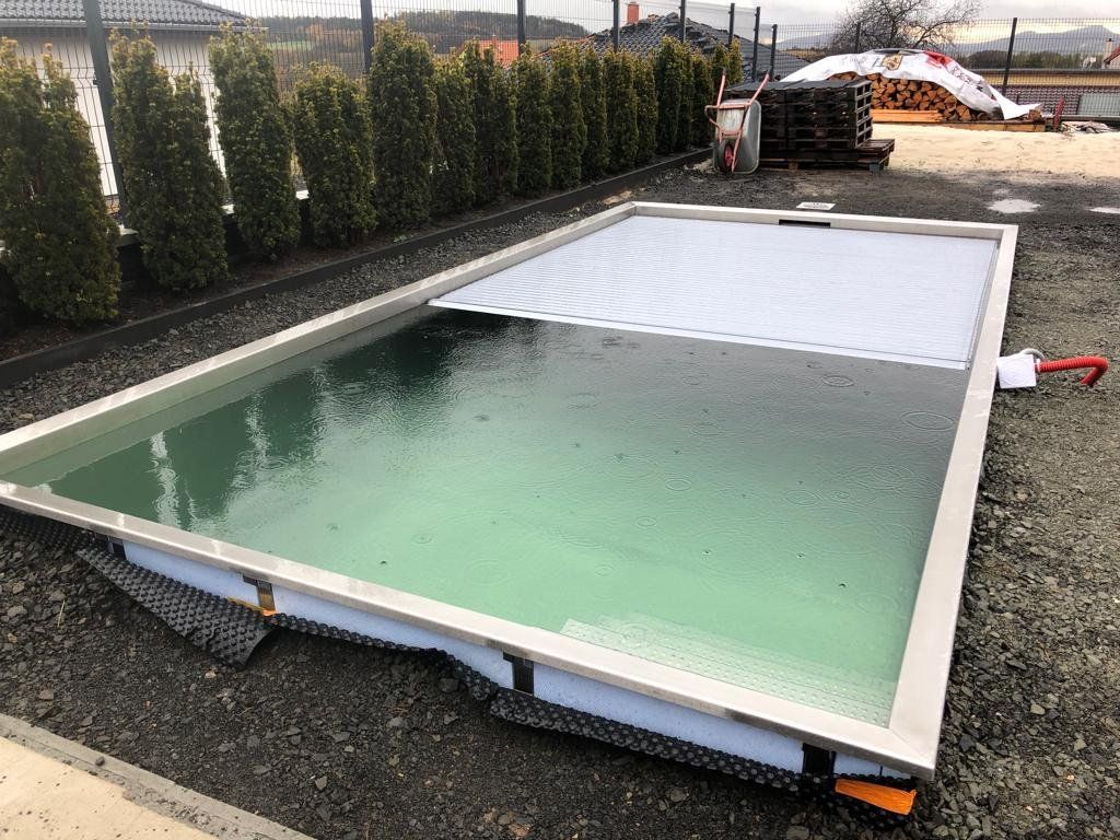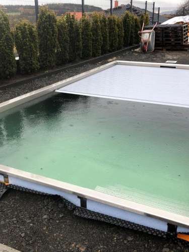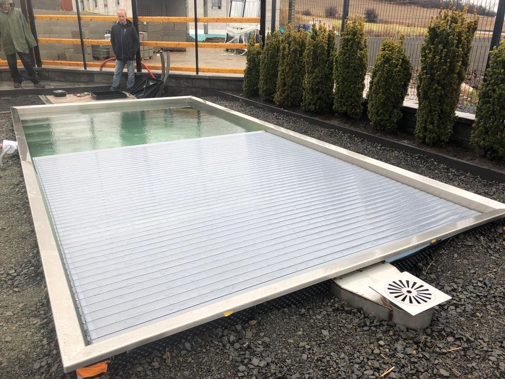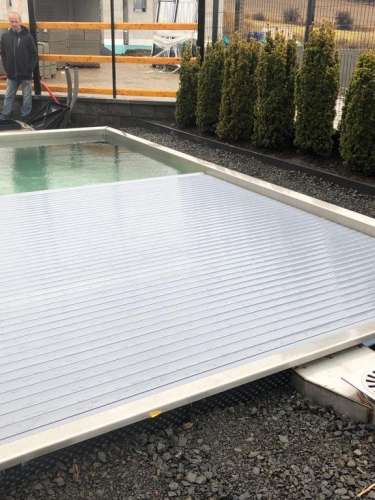 Skimmerový bazén o rozměrch 6x3m má elegantní lamelové zakrytí. Podvodní lamela je instalována ve stěně bazénu a nezmenšuje tedy užitnou plochu bazénu.