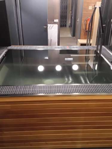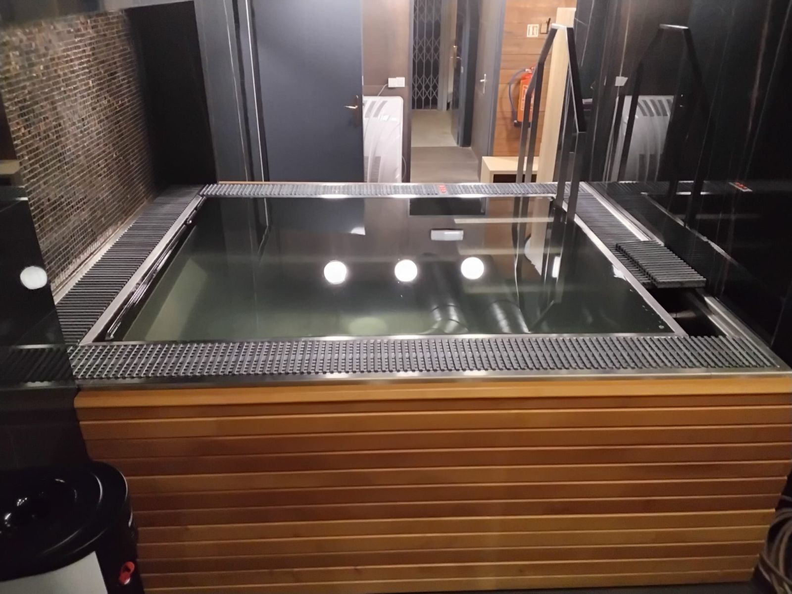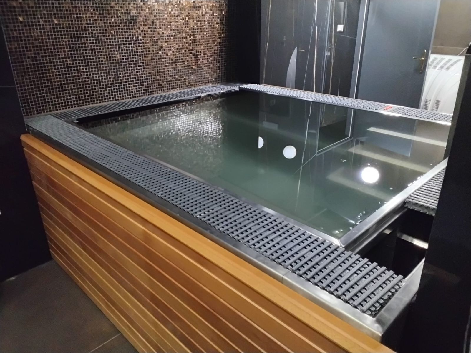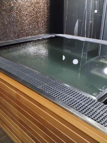 Veřejná přelivová vířivka vybavená plechovými lavicemi, masážními a vzduchovacími tryskami a podvodní roletou, která zabraňuje nadměrnému odparu vody a pomáhá udžovat její teplotu.