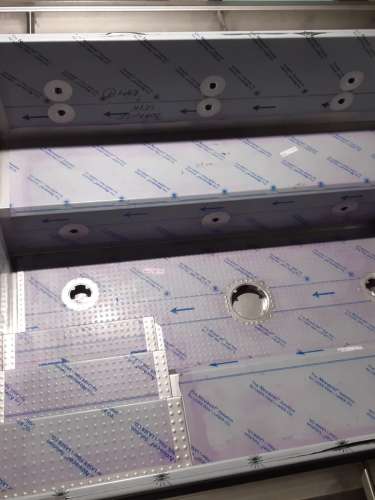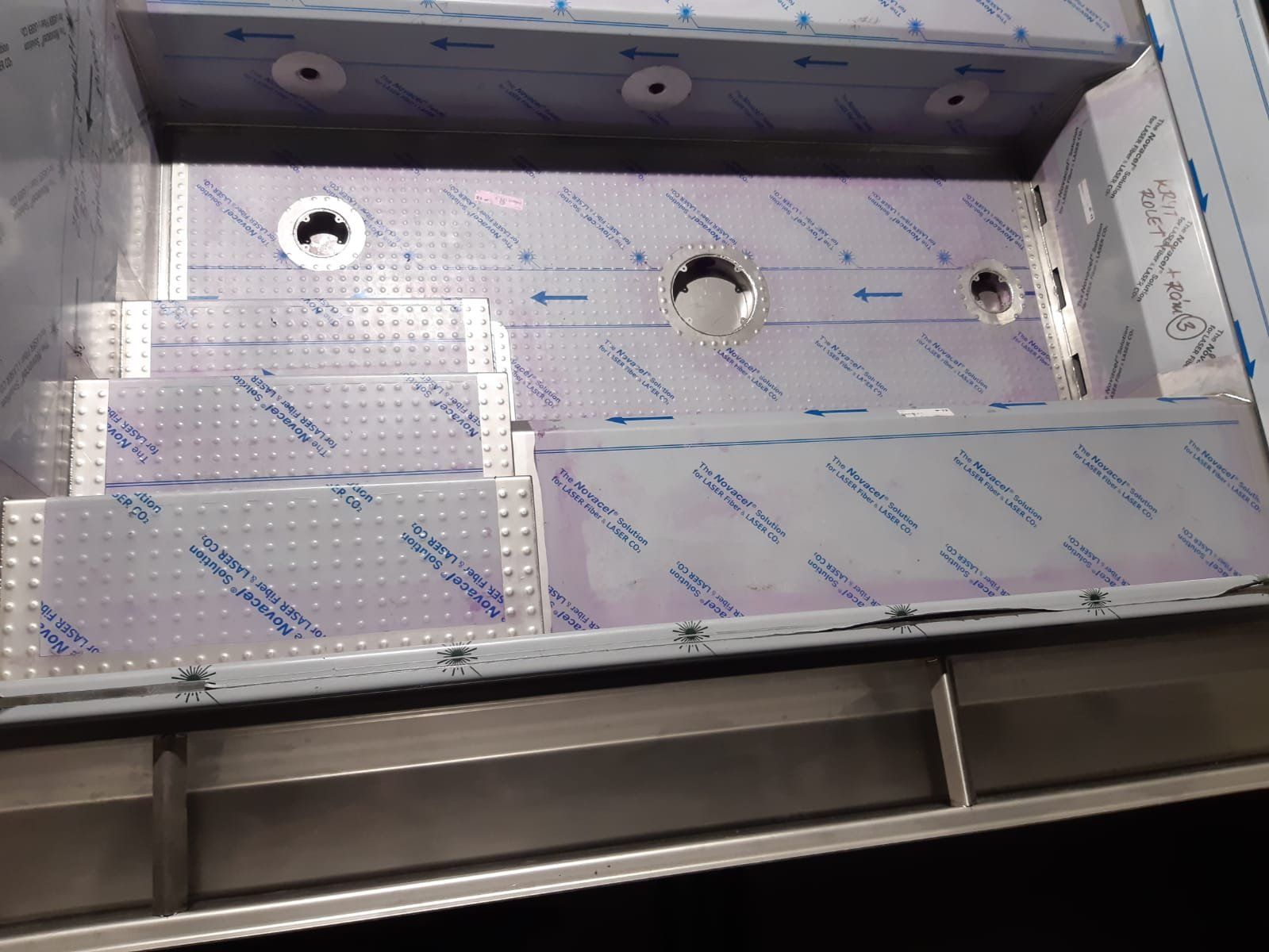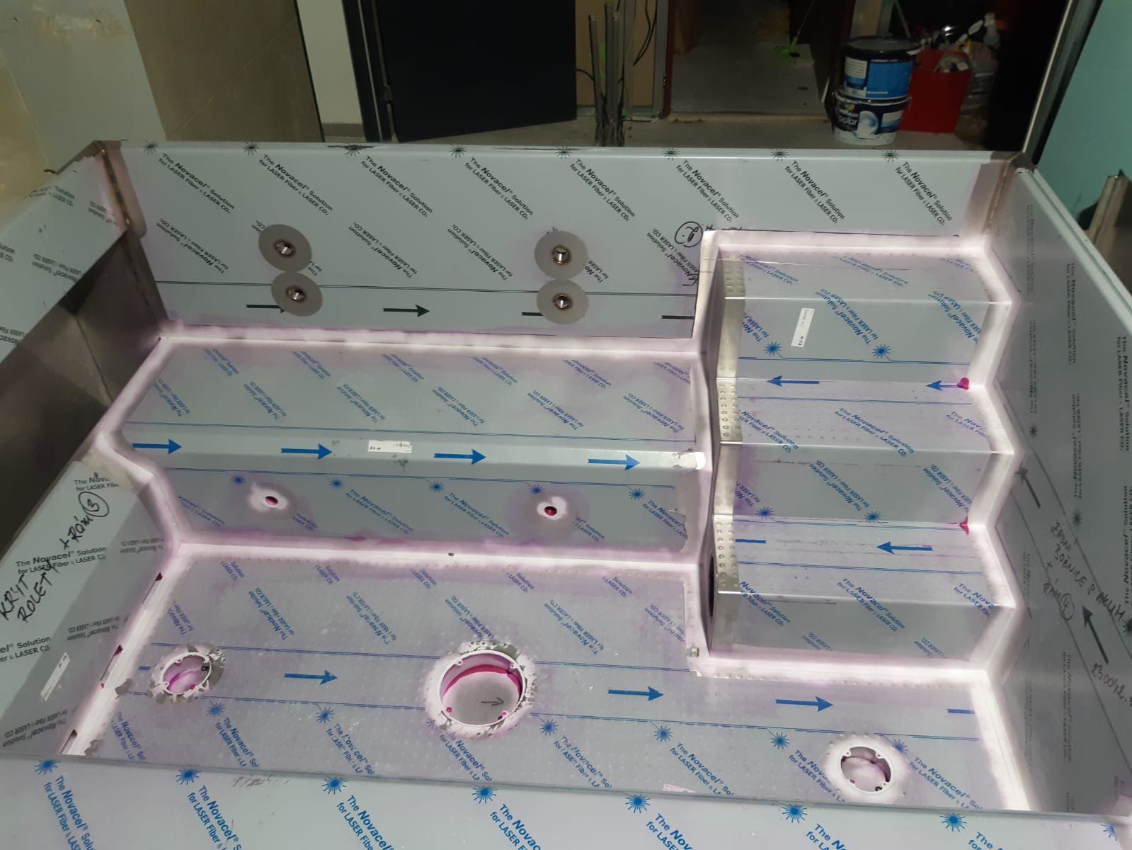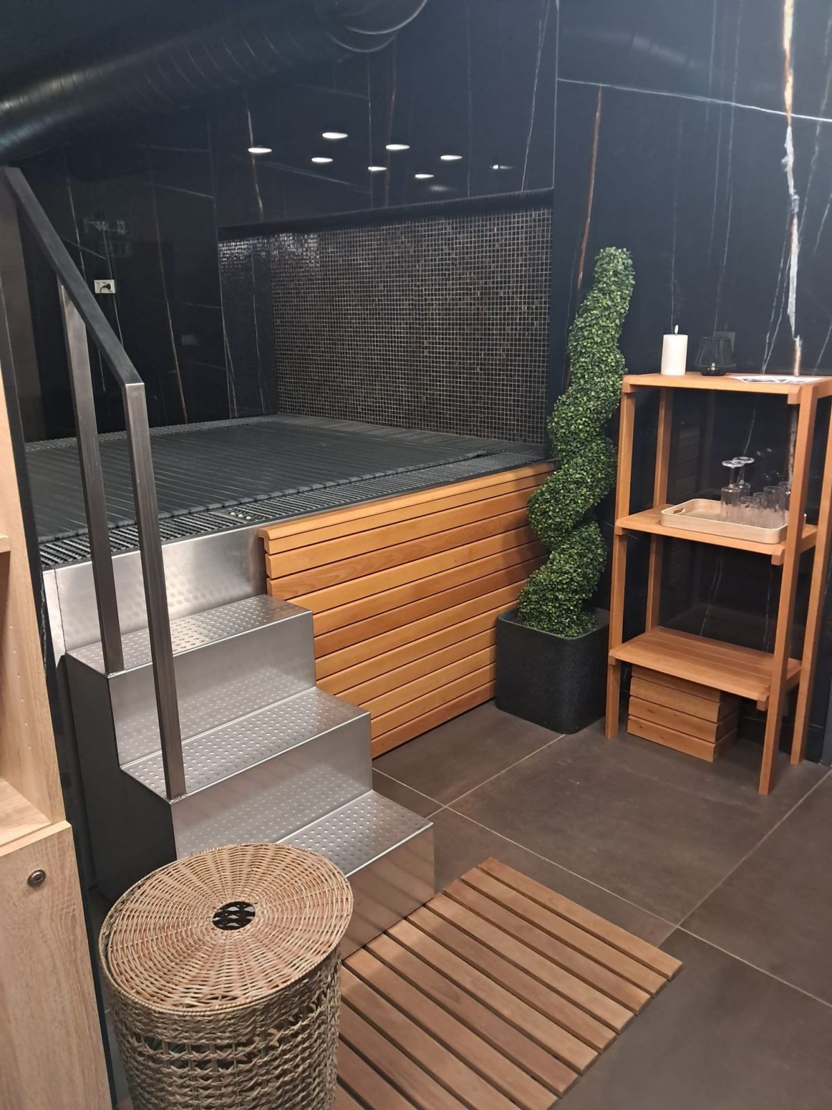 Veřejná přelivová vířivka vybavená plechovými lavicemi, masážními a vzduchovacími tryskami a podvodní roletou, která zabraňuje nadměrnému odparu vody a pomáhá udžovat její teplotu.