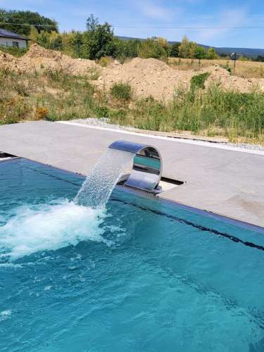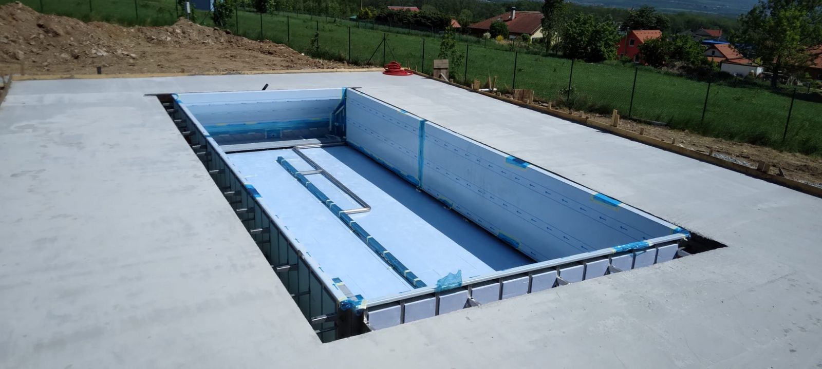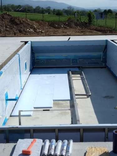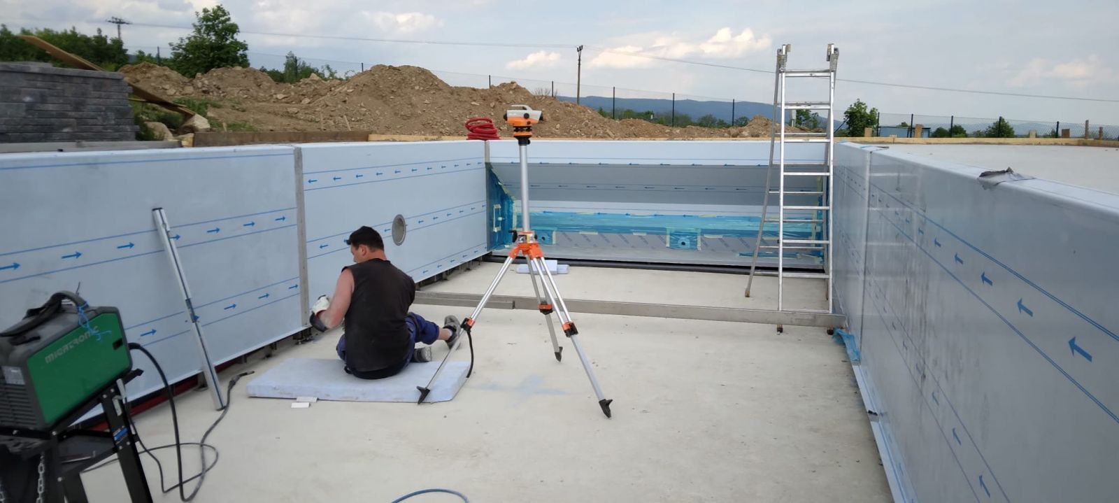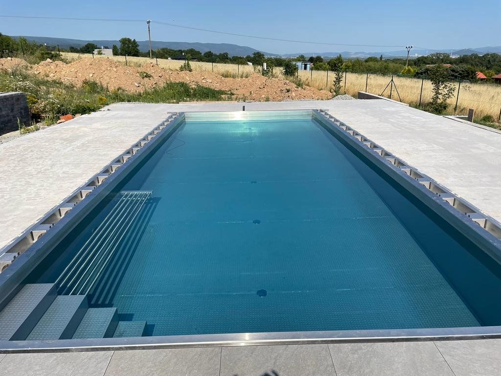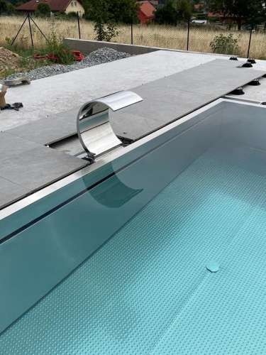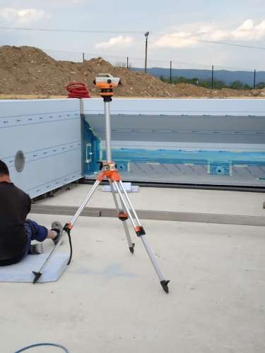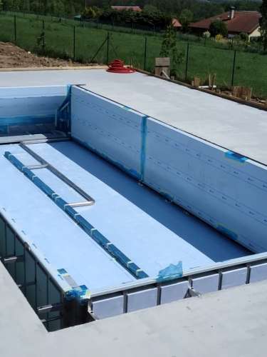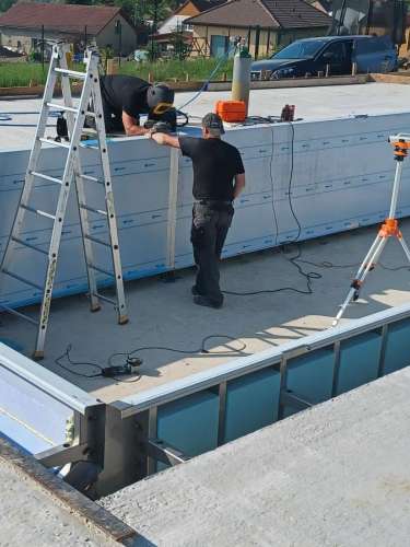 Přelivový bazén o rozměrch 10x4m je právě montován u zákazníka. Bude ukrývat ve stěně bazénu podvodní roletu na zakrytí bazénu. Připraven je pro instalaci lavice se vzduchováním a chrliče na vodu.
