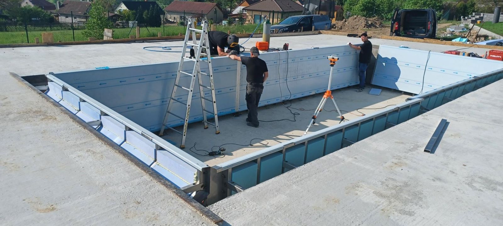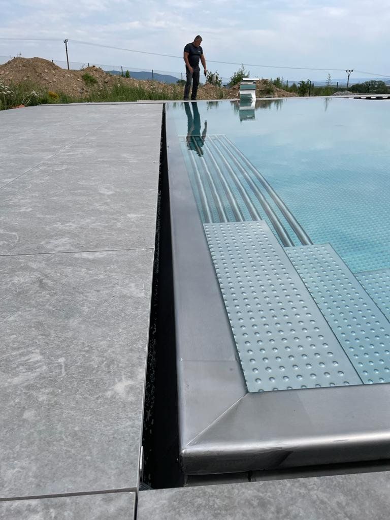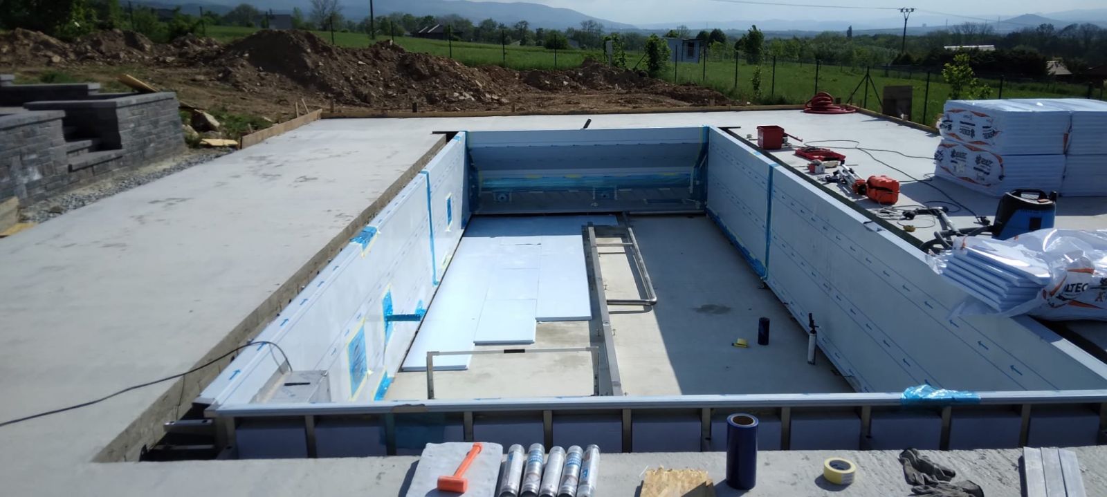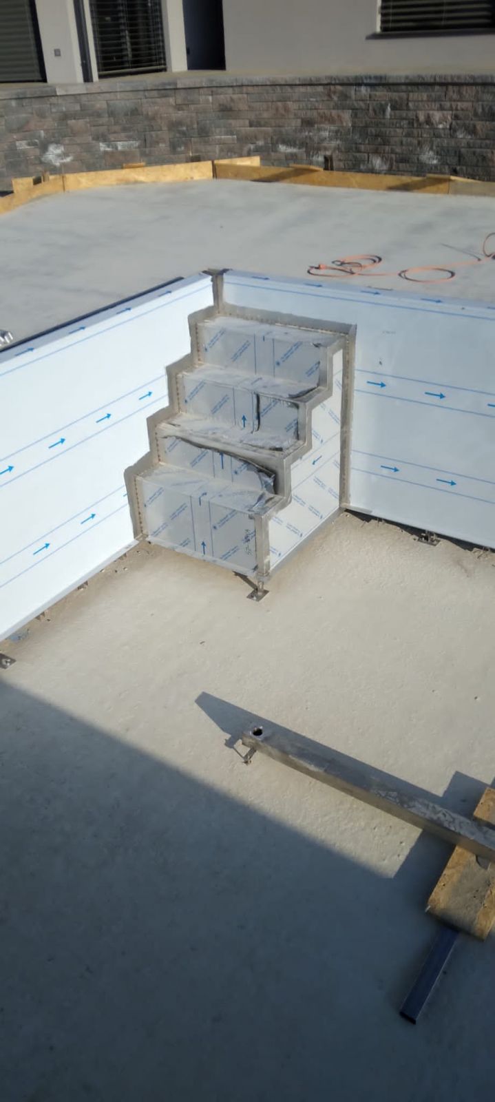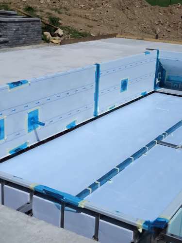 Přelivový bazén o rozměrch 10x4m je právě montován u zákazníka. Bude ukrývat ve stěně bazénu podvodní roletu na zakrytí bazénu. Připraven je pro instalaci lavice se vzduchováním a chrliče na vodu.