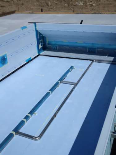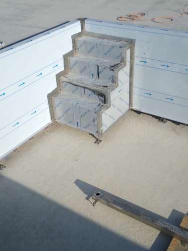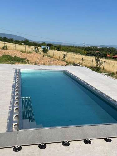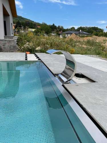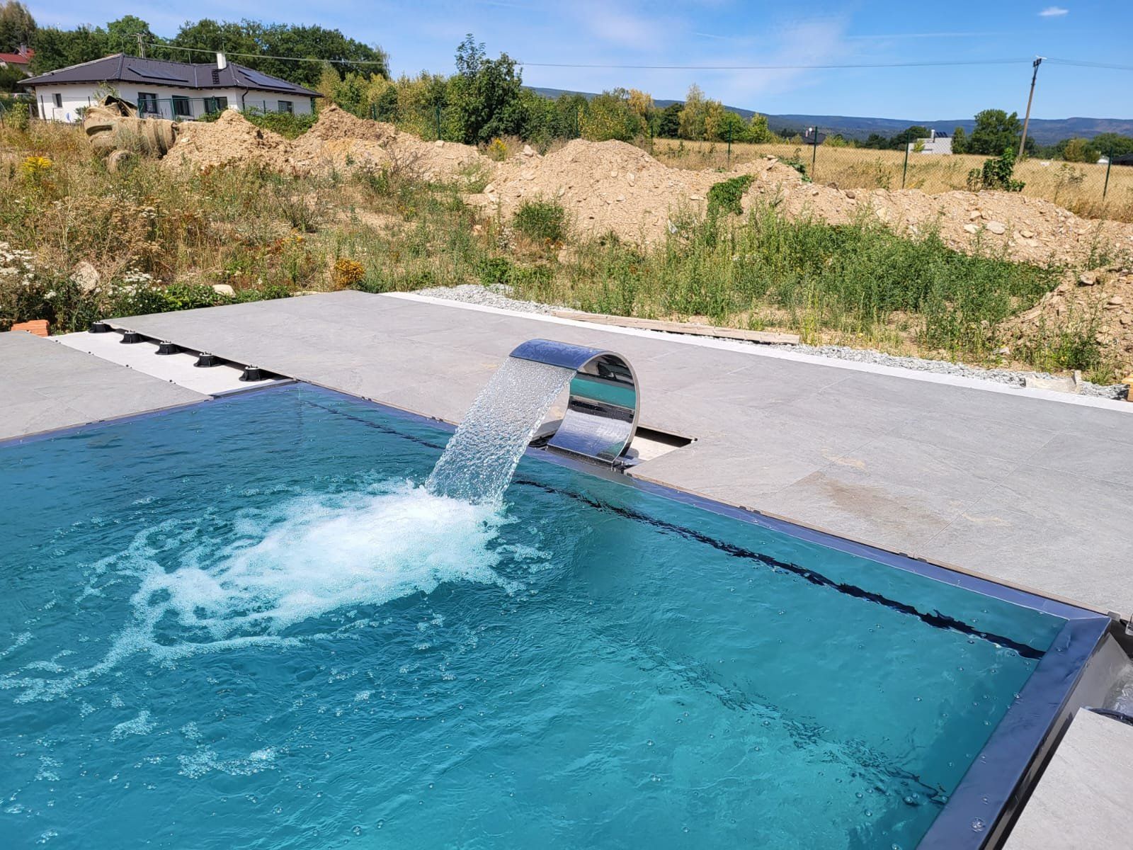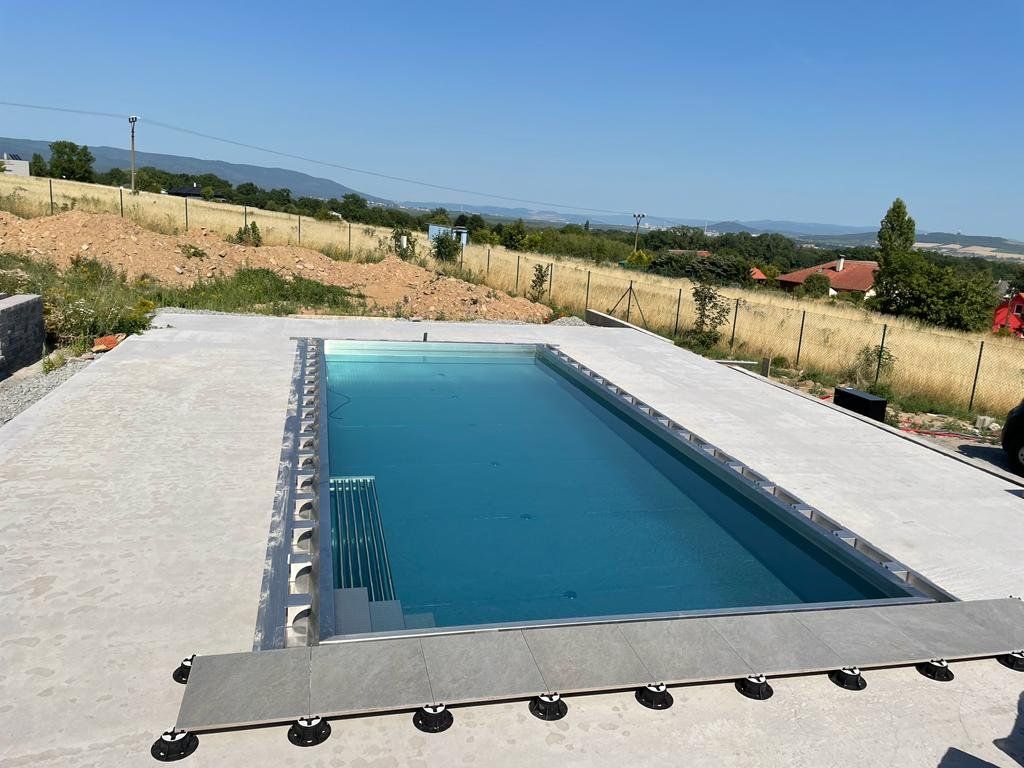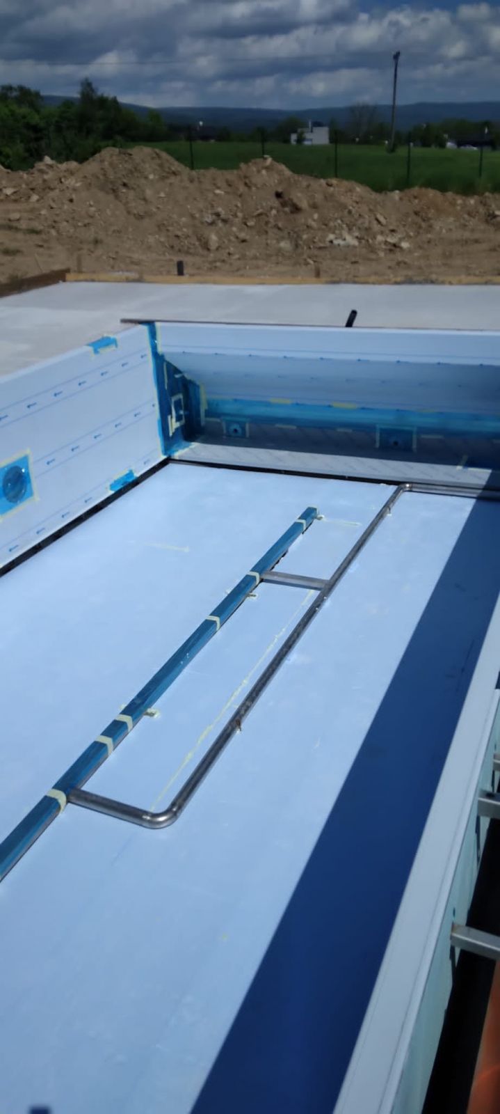 Přelivový bazén o rozměrch 10x4m je právě montován u zákazníka. Bude ukrývat ve stěně bazénu podvodní roletu na zakrytí bazénu. Připraven je pro instalaci lavice se vzduchováním a chrliče na vodu.