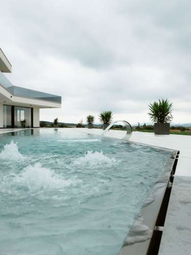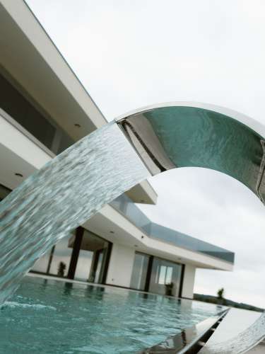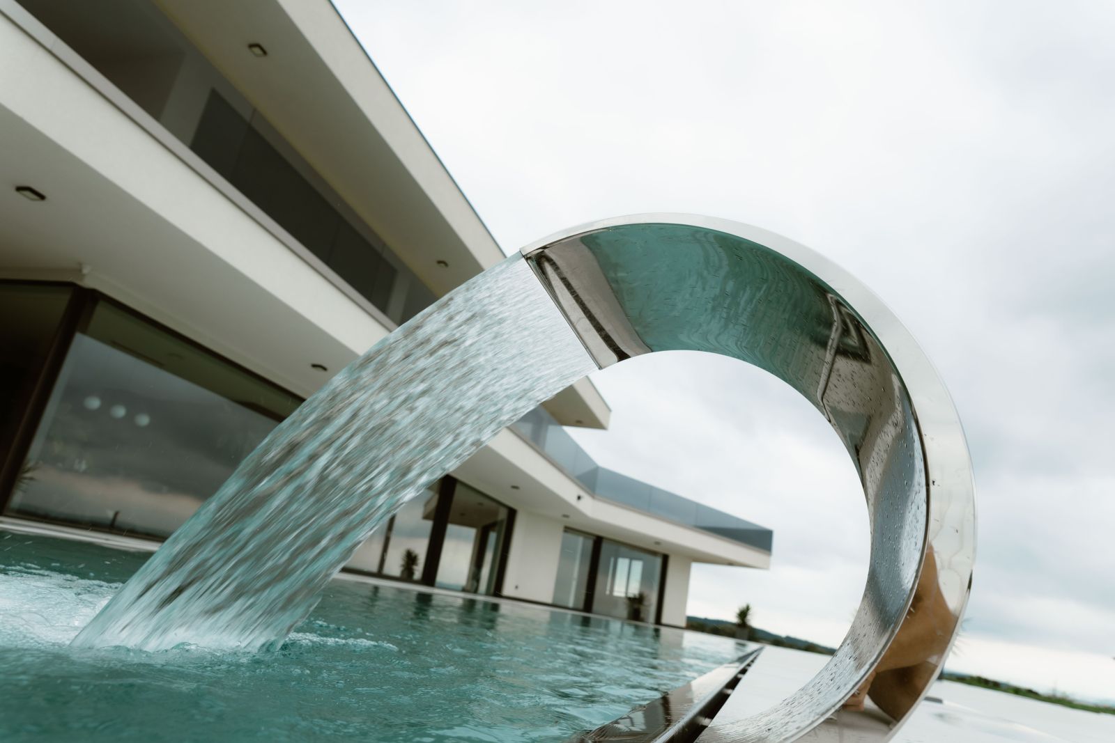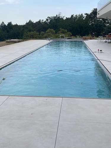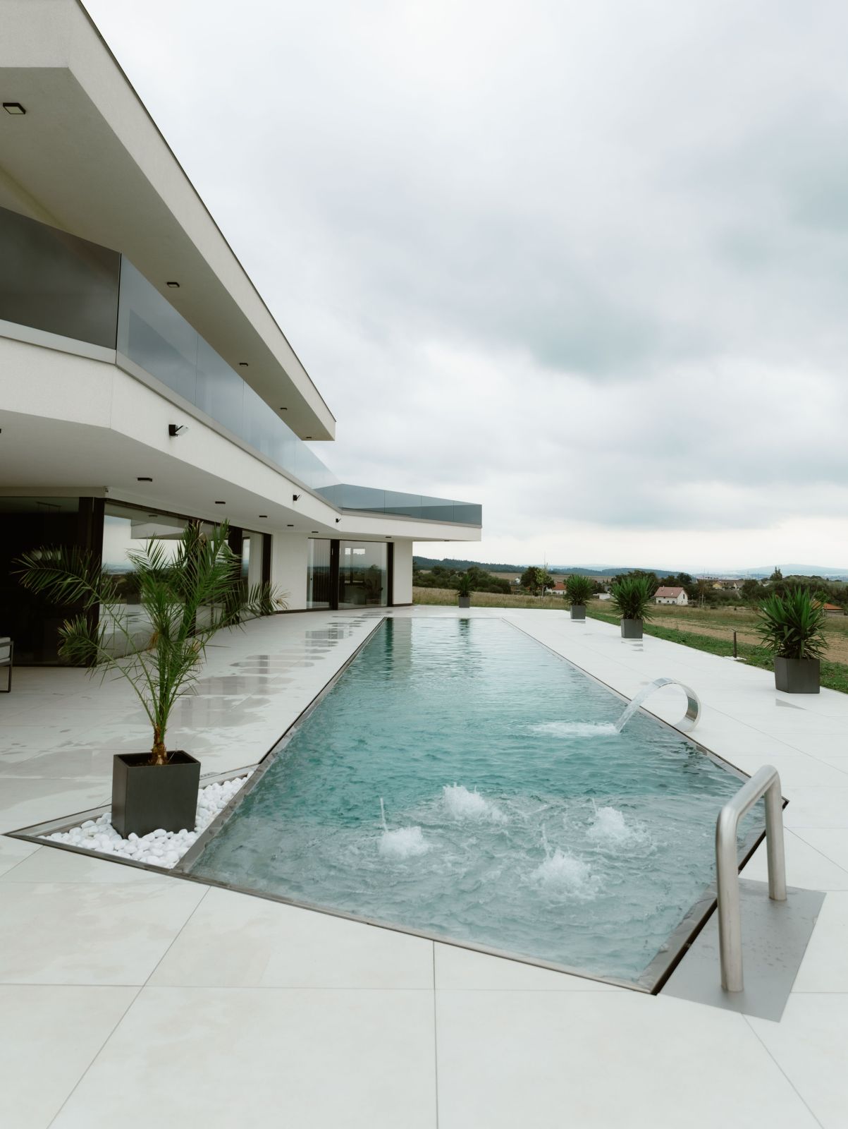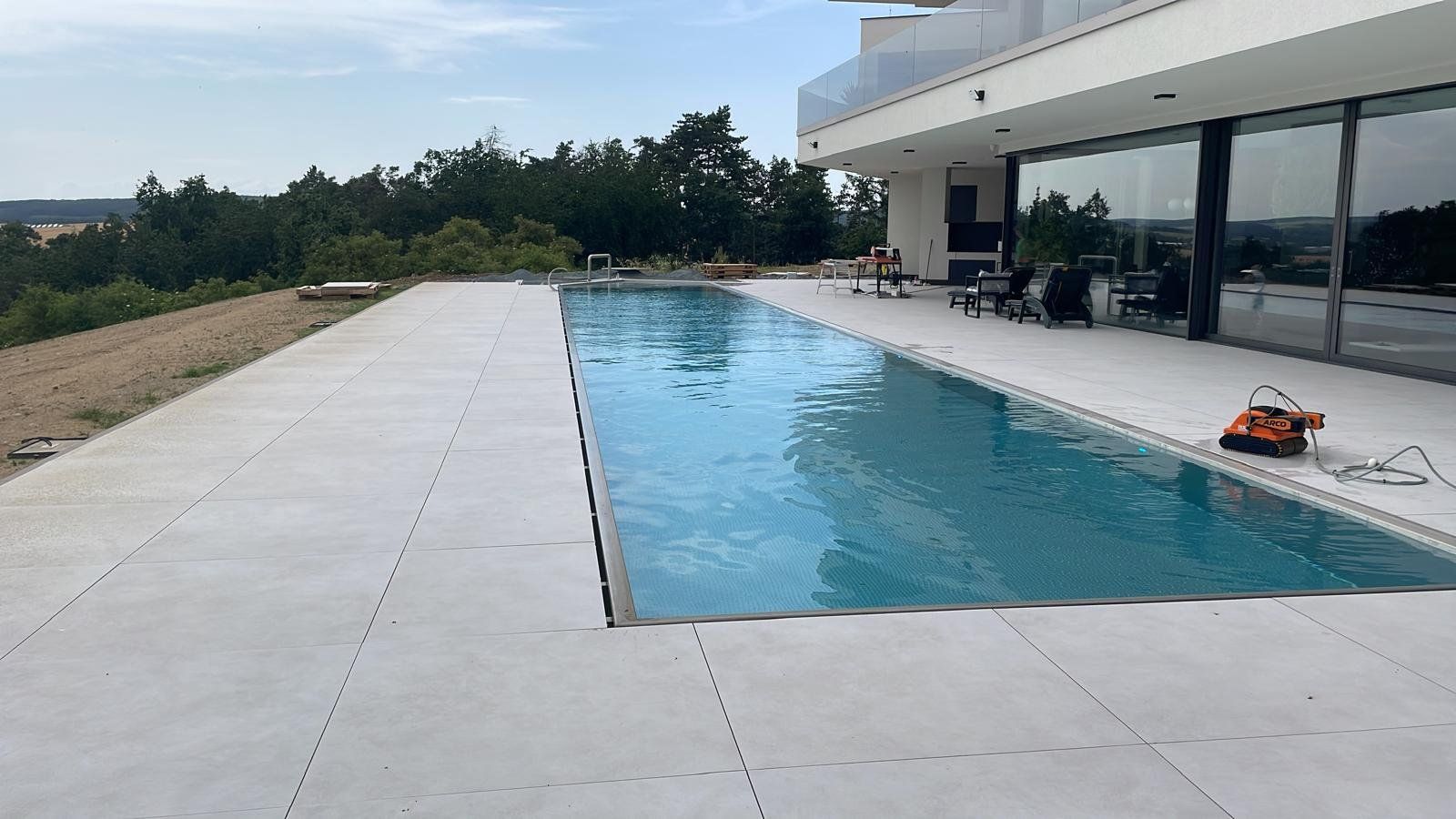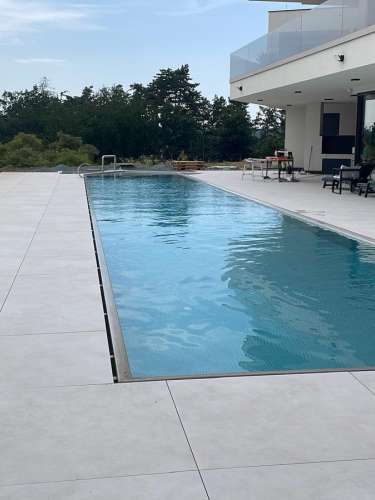 Zbývá již jen dokončit pokládku dlažby, ketrá bude skrývat nerezový žlab a voda bude přepadávat do odtokové štěrbiny.