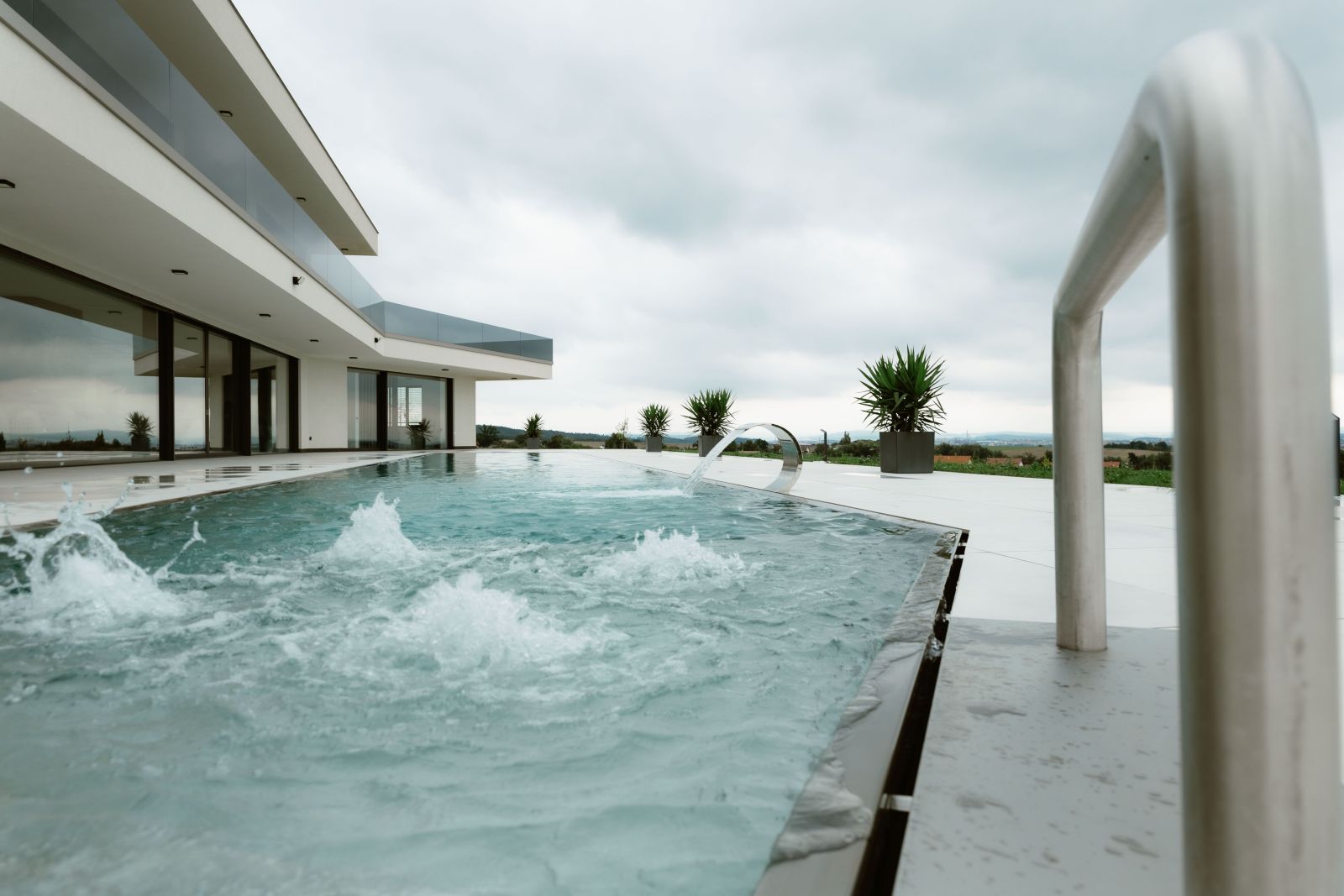 Osazne je již nerezový chrlič a podvodní releta. Bazén je taktéž vybaven podvodními LED reflektory, které dodají bazénu finální estetický vzhled.