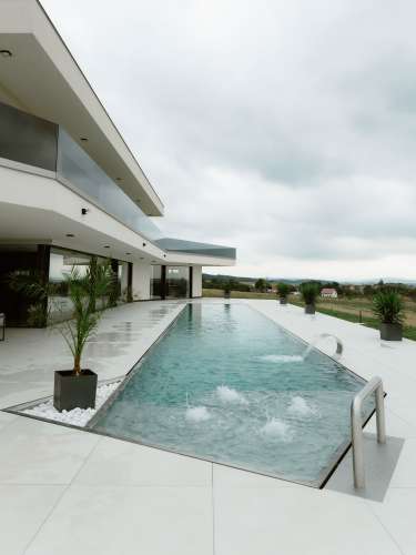 Nerezový přelivový bazén se skrytým žlabem celkové délky 28m. Plavecká část bazénu je dlouhá 25m. Šíře bazénu 4m.